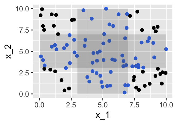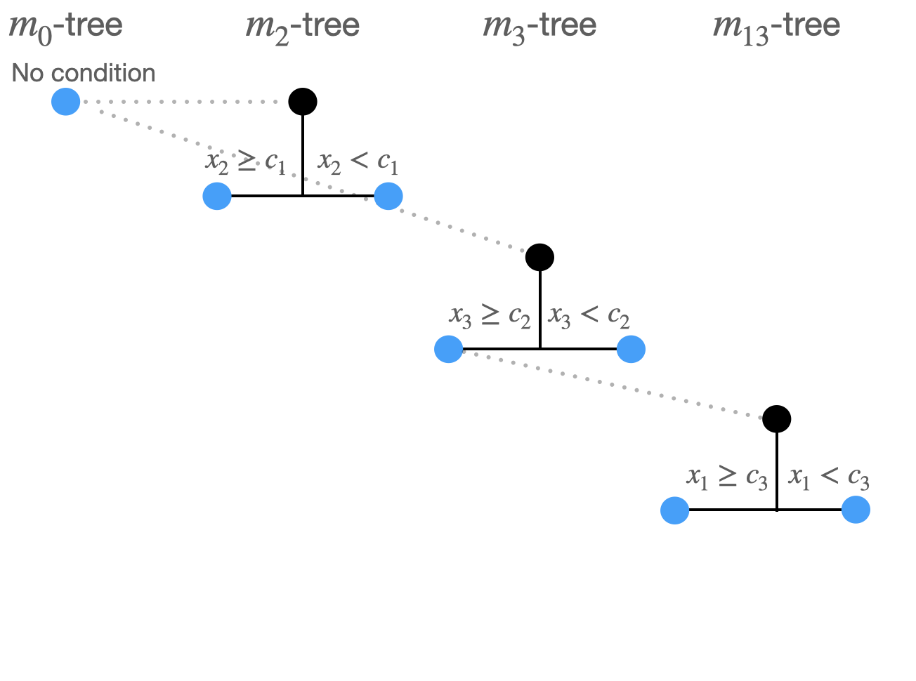 \(split_{try}:\)For each viable split option we consider 5 randomly picked split points \(\rightarrow\) \(2\times5=10\) split options.