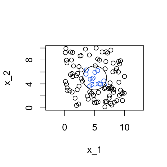 We find 19 observations within a distance of 2 units from the middle point (5,5).